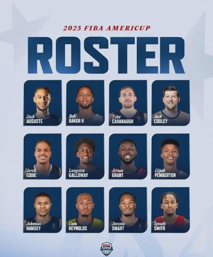 出战本届美洲杯的美国男篮阵容,无一NBA现役球员,甚至叫得上名字的都寥寥无几,成员主要来自海外联赛(如日本、德国、南美)及发展联盟等等,具体名单如下: