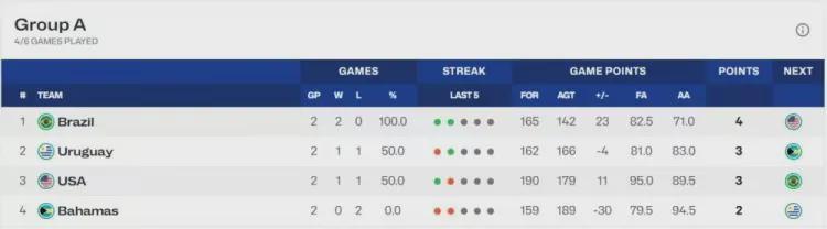 爆冷输给乌拉圭之后,美国男篮的出线形势急转直下,目前以1胜1负排名小组第三,小组赛收官战对阵头号强敌巴西。
